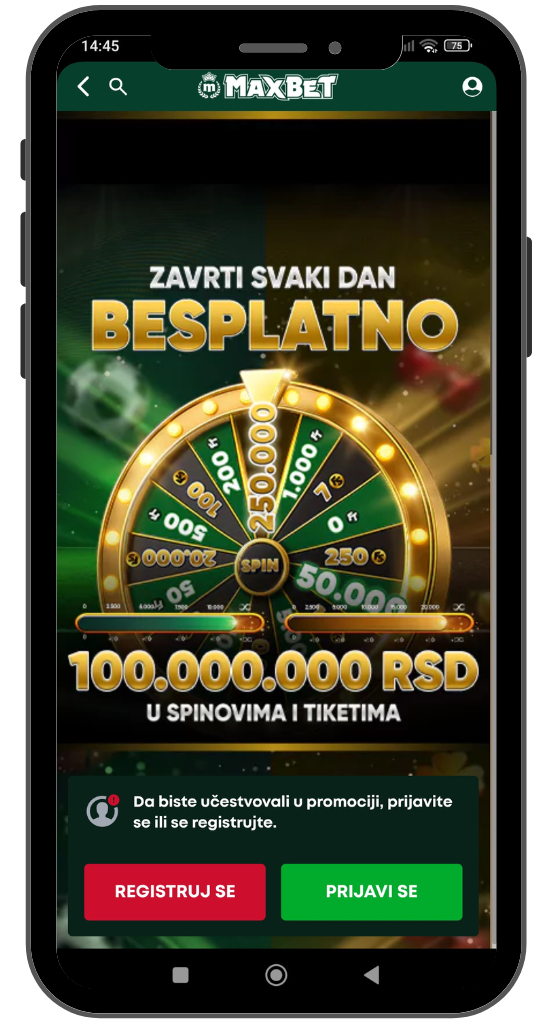- MaxBet mobilni kazino točak sreće – svakog dana možete zavrteti točak sreće i osvojiti spinove ili fribetove u određenoj vrednosti, u zavisnosti od toga koliko budete imali sreće.